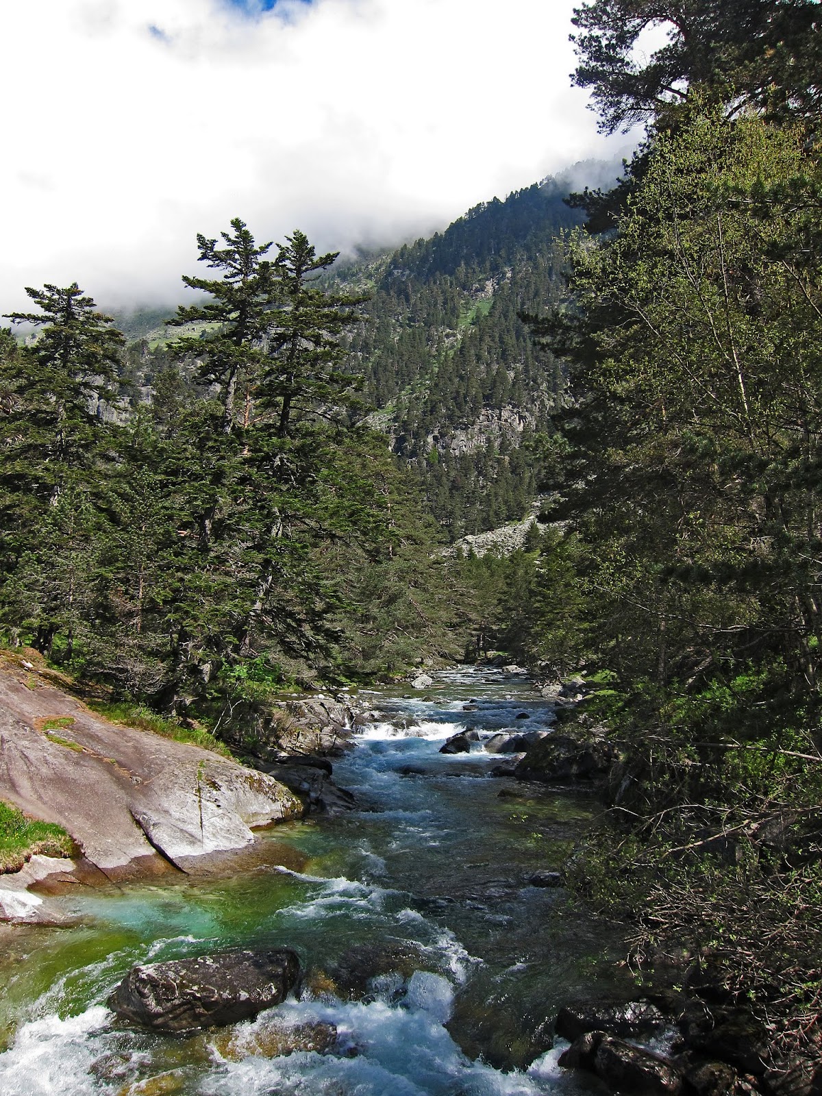 Comenzamos el ascenso dejando el torrente a nuestra izquierda y atravesando un tramo en el que se intercalan los abetos, praderas y grandes bloques de piedra.