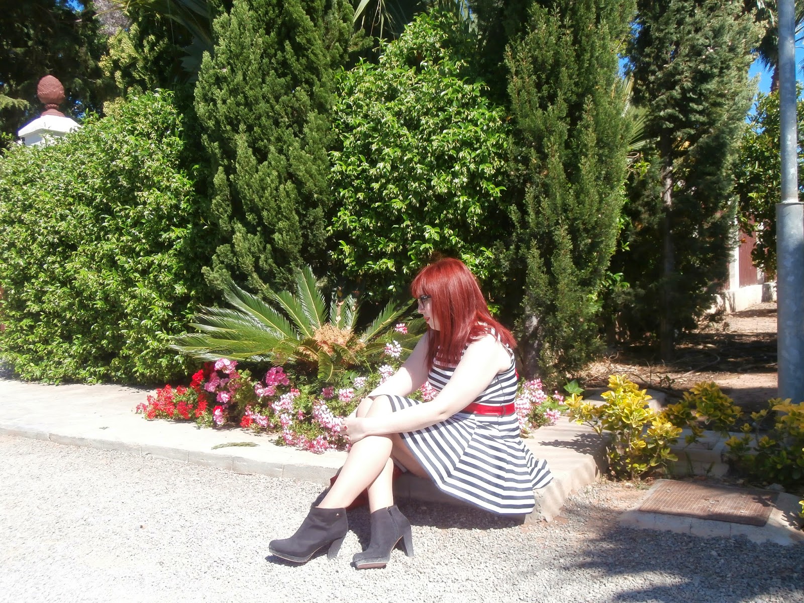 Pues ya veis, vestido de marinerita sin mangas con cinturoncito rojo, una torerita roja a juego y los botines negros... me pasé media vida buscando zapatos rojos y a última hora miré como quedaban los botines y quedaban bien! jajaja.