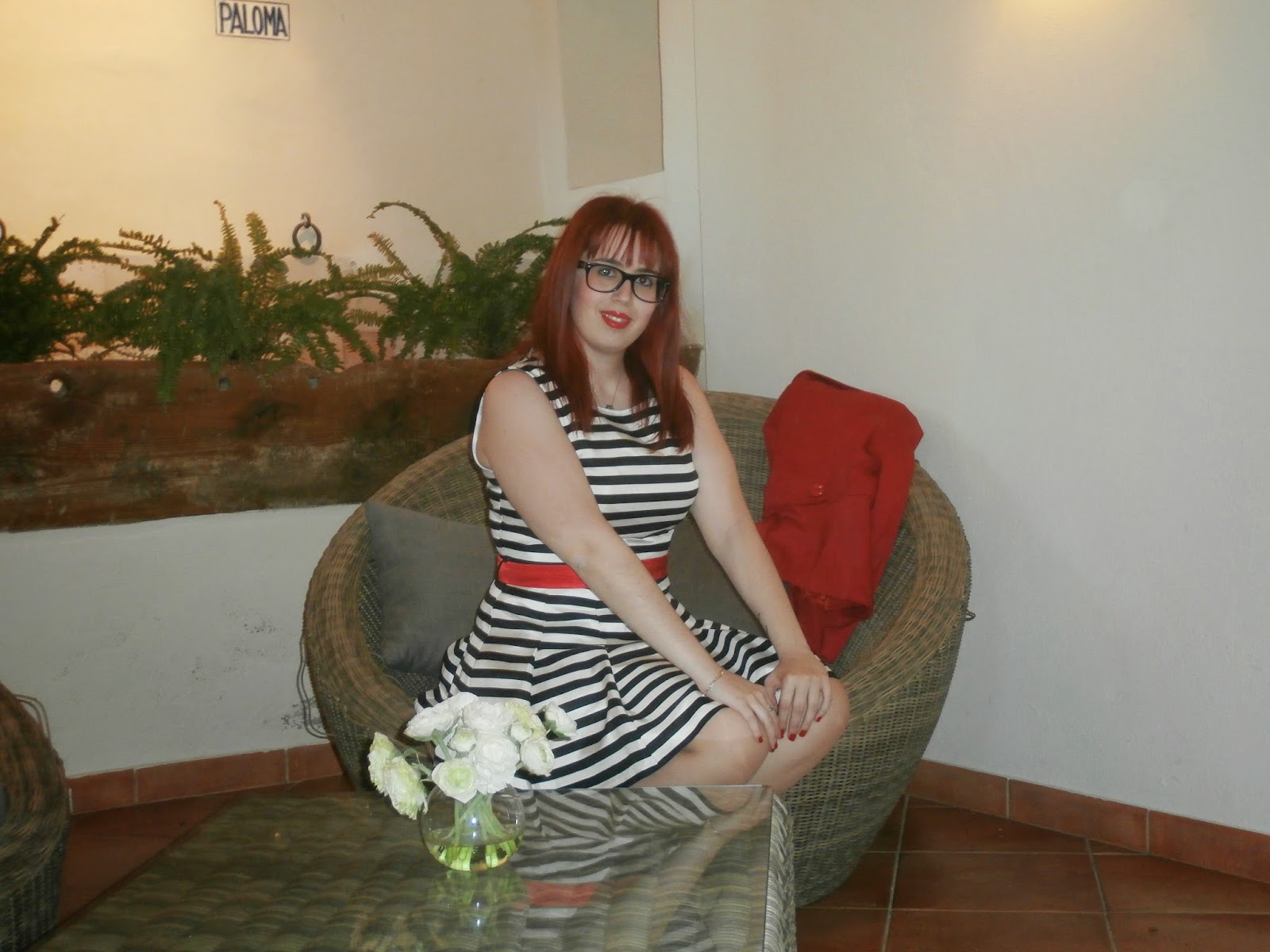 Y aquí veis bien mi nuevo corte, mi flequillito, al principio lo odié pero ya me estoy acostumbrando. El maquillaje muy sencillo, un poquito de eyeliner, colorete rosa, uñas rojas y pintalabios rojo.