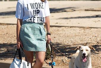Buenos días! Qué mejor que estos días de solecito para ir a dar un paseo con nuestras mascotas? Es verdad que para sacarlas a pasear hay que ir lo más cómodas posibles por lo que un zapato plano es siempre la mejor opción y el resto...lo más fresquitas que podamos pero en nuestro caso buscando un look no muy sport ya que es el mismo que llevamos a trabajar, que si no nos toca cambiar mil veces de ropa durante el día.Nosotras optamos por una camiseta blanca y ancha pero con un mensaje muy divertido en el frontal para darle un toque diferente al look, y es que las camisetas con letreros nos llaman mucho la atención en otra gente y nos parecen super graciosas a la hora de llevarlas.Y hoy casi todas las prendas que llevo son nuevas o regalos de mi cumpleaños; os las mostramos en el anterior post de compras del mes de junio que podéis ver aquí, como el bolso y los pendientes, a parte de la camiseta. ¡Que paséis un feliz día!Good Morning! Is there a better time to go out with you pets than summer? And for this you always need to go comfortable with flat shoes and the rest...something very light in this hot but we chose something not very sporty because we work with those clothes as well.We chose a white t-shirt with a slogan, we love these t-shirts when people wear them because we always read the slogan and we think they are very funny.And in today's outfit everything is new from last month and some presents that you can see in here. Happy day!