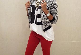 Utilicé un bomber de la marca Shana en estampado blanco con negro, y un súeter con gráfico, lo complementé con un pantalón en color rojo para animar el look. El collar lo amo...es de flores metalizadas, llama mucho la atención, siento que es el toque chic del outfit.