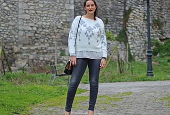 Como es un jersey algo cortito, decidí ponerme una blusa de Biombo13 gris clarita por debajo, de manera que combinase con el bordado del jersey y para no romper la gama de colores del look, escogí unos pantalones gris oscuro y unos zapatos de tacón negro.