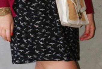 El vestido de palabra de honor en negro tiene un estampado con pájaros en blanco, por lo que es muy fácil encontrar complementos que combinen a la perfección. Nosotras hemos optado por un collar con motivos románticos y una pulsera dorada a conjunto.