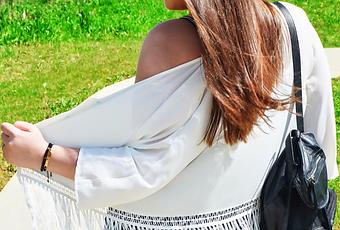 Además con este tipo de pantalones, yo creo que lo mejor para que la figura quede lo mas bonita posible, es, si lo necesitas... añadir una chaqueta que termine en la cintura. Y yo cuando vi esta chaqueta tan vaporosa & con flequitos me quede loca de amor, y super en ese momento que sería perfecta para con el pantalón.