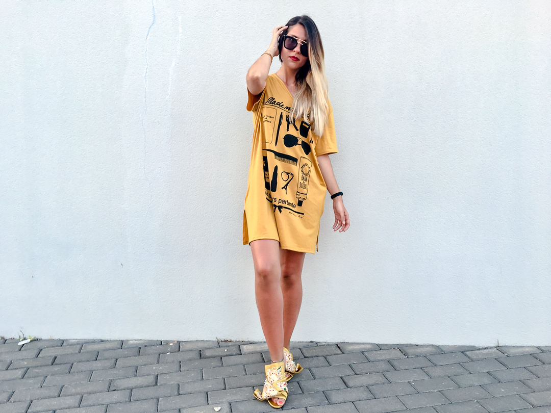 Y ya por fin, antes de acostarme, vengo a enseñaros un nuevo post con un look de estilo oversize. Y es que con esta calor, lo que más me apetece ponerme es un vestidito anchito y fresquito como el mío de 21 BOTONES de color mostaza y estampado muy chic, para que no olvidéis los básicos que hay que llevar de vacaciones!