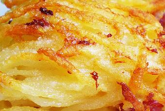 Cortar en juliana el jamón. Reservar Pelar, lavar las patatas y rallarlas.