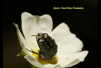 Datos de la Especie: Es un escarabajo de cuerpo redondeado con antenas terminadas en forma de peine que puede mover a voluntad. Mide 1 cm. Su cuerpo es negro con reflejos cobrizos o violáceos, puntitos blancos irregulares en el dorso y un recubrimiento de pelos largos y claros. Al volar provoca un zumbido como el de las abejas. Su nombre científico funesta se debe al color oscuro. En primavera y a principios de verano, Oxythyrea funesta es muy común sobre las flores grandes, como las de las rosáceas y cistáceas, alimentándose de polen, néctar y de los propios órganos florales. Su comportamiento es bruto, por lo que daña las flores por las que pasa.
