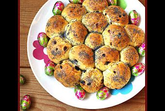 Utilizar un molde redondo, previamente engrasado y enharinado. Colocar una bola de masa en el centro, rodear de otras cinco y colocar las restantes diez alrededor, formando una flor. Pintar con un poquito de leche y espolvorear con las semillas de amapola. Tapar con un paño y dejar reposar durante 30 minutos en un lugar cálido.