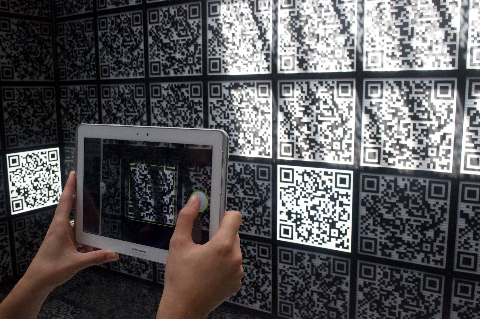 Curiosas coincidencias las que se encuentra uno paseando por los jardines de la Bienal. España, justo al lado de la entrada, tiene su pabellón al lado del belga, que lo tiene al lado del holandés, de modo que los miembros de los Países Bajos, hace almenos un lustro, pueden elaborar una versión arquitectónica del cuento de los Tercios Malos que Roban Niños. Además, España, el país donde menos se lee de toda la Unión Europea, queda enfrentada con el Pavellón-Librería que James Stirling y Michael Wilford construyeron para Electa (descripción aquí). Venecia, al lado de Egipto y Grecia. Austria, arrinconada. Australia, entre Chequia y Eslovaquia y Francia. Y Rusia, ante los Países del Norte (Dinamarca aparte), al lado de Venezuela, al lado del mismo Japón al que se ha enfrentado en tantas guerras. El Pabellón Ruso permanente es una especie de instalación neoclásica relativamente absurda, uno de los peores concebidos de todos los Jardines, con dos pisos interconectados pobremente, muchos metros cuadrados por llenar y una fachada compleja, difícil de entender, que gasta una gran cantidad de superficie en una escaleras imperiales bastante extrañas. Este año el pabellón aloja la instalación más fascinante, a mi entender, de la Bienal. La comunicación entre las dos plantas se ha cegado completamente, como si Rusia presentase dos muestras independientes. La planta superior presenta una muestra basada en un solo elemento: los Códigos QR. Así, la estructura clásica del pabellón (diversas salas de geometrías más o menos paralelepipédicas interconectadas entre ellas respondiendo a los caprichos de quien las concibió) se ha respetado íntegramente, forrándose cada sala con una especie de losetas plasticosas, de brillo metálico, retroiluminadas, conteniendo cada una de ellas un código QR. Que funciona. Pavimento, paredes, techo. Todo losetas con códigos QR. Esta capa forra interiormente el pabellón por aproximación, de una manera holagada: la precisión del encaje entre el pabellón temporal y el que lo aloja no es importante. Como si hubiesen encajado dos matroixcas de modelos diferentes.