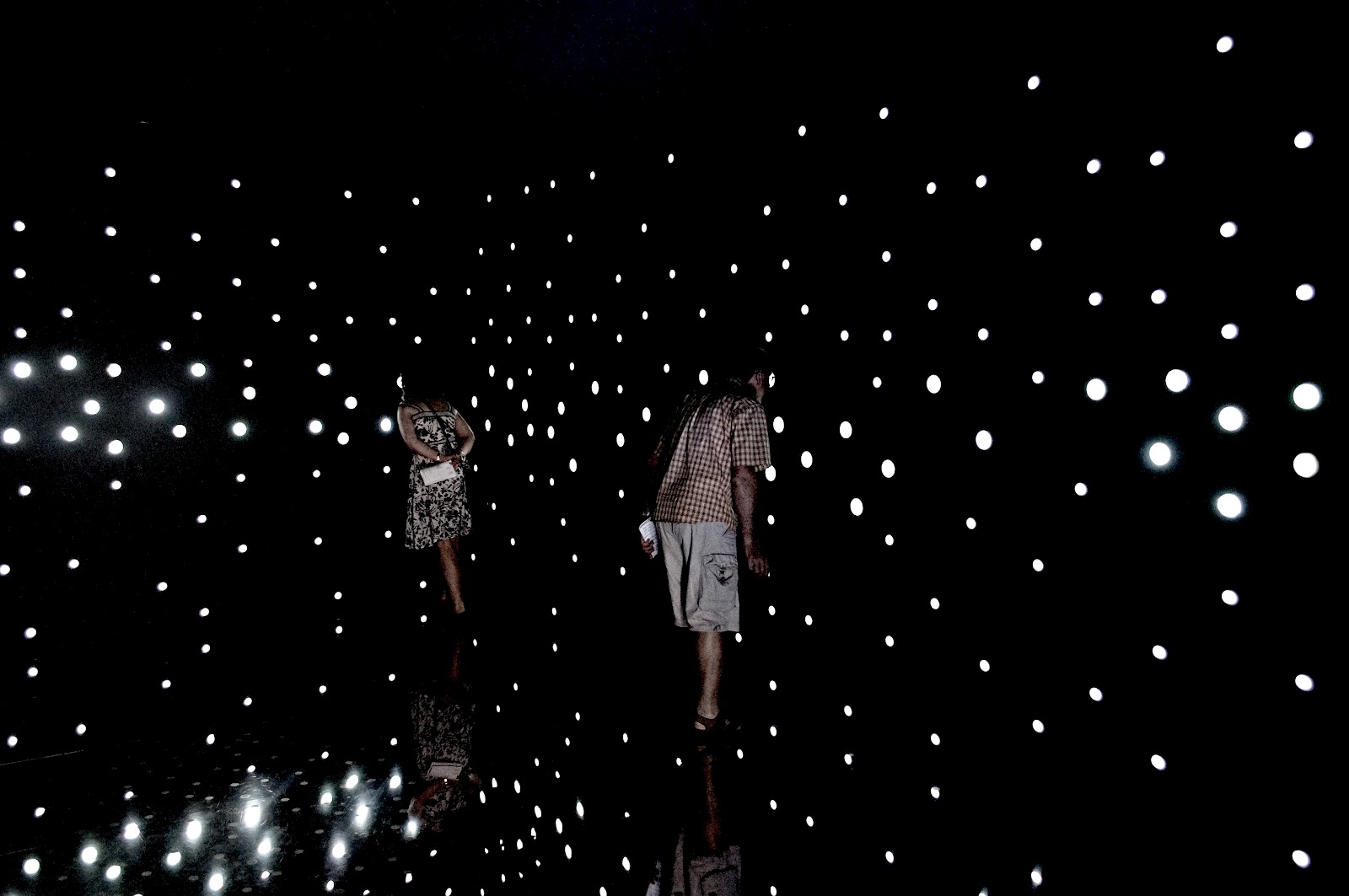 En la entrada de la planta superior, cada visitante recibe un iPad con un software de lectura de códigos QR creado específicamente para este pabellón. Uno llega a uno de los códigos (que se van retroiluminando al azar, facilitando tanto su escaneo como el hecho que éste se haga aleatoriamente), lo escanea y, con todos los demás, llegan a contar un proyecto de una nueva ciudad rusa concebida vía concurso internacional donde algunos de los arquitectos principales del mundo compitieron primero por su ordenación y luego por la construcción de diversas piezas clave. Se encuentra mucha información: las propuestas de concurso de ordenación ganadoras y perdedoras y todas las propuestas de construcción de barrios. No sé si alguna de las perdedoras también. La enorme cantidad de códigos QR necesarios para forrar el pabellón hacen que muchos de éstos se repitan. En realidad estamos hablando de una familia de códigos agrupados entre ellos al azarosamente, pautas de azar sobre pautas de azar: la disposición de los códigos, su retroiluminación a la buena de Dios, el humor de los visitantes y su grado de indisciplina, que hará que vayan escaneando, o no, todos los proyectos representados. En la planta inferior, entrando directametne desde el pavimento de sablón de los Jardines, el espacio se ha negado completamente: todo está pintado de negro de modo total y absoluto. No hay ningún tipo de iluminación ambiente. La lógica, la misma: se entra y se sale por la misma puerta, caminas y te desorientas. No tiene más. Ni tan sólo hace falta, en este caso, condicionar el espacio interiormente: ¿para qué si está pintado de negro-boca-del-lobo y no tiene iluminación?