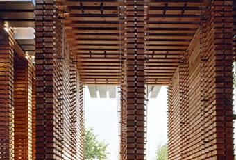 Las vigas que forman las paredes son todas del mismo tamaño. Están separadas con otras maderas y apiladas como si de un secadero de madera se tratase. Las paredes están unidas con barras a tensión y muelles de acero. Otra serie de vigas, puestas perpendicularmente al nivel de la cubierta, cubren el espacio interior del pabellón y rigidizan el conjunto. Toda la estructura trabaja solamente por comprensión y por la fricción de las vigas entre si causada por el apilamiento de éstas. La unión mediante tirantes y muelles de acero permite el cambio dimensional de las maderas al secarse y es acorde con el carácter temporal del edificio. Ni un solo tornillo, clavo, pinza, estaca, agujero o gota de pegamento se utilizó para la puesta en obra del proyecto.