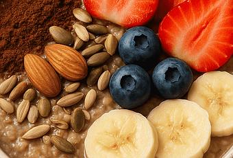 Preparación: Mezclar los copos de avena y la leche en un bol y cocinar (al microondas o en cazo) hasta alcanzar la textura deseada. Incorporar el cacao soluble Paccari y remover bien. Añadir el plátano, las frutas, semillas y frutos secos. Servir tibio o frío según se prefiera y disfrutar de un desayuno saciante y delicioso.