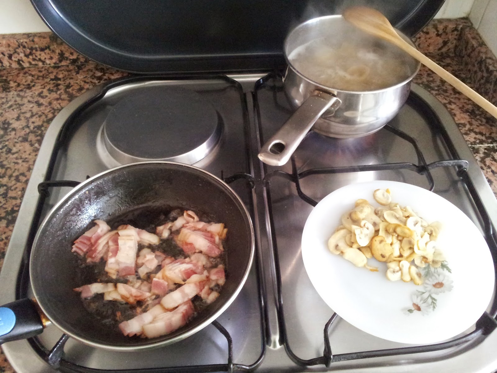 Mientras tanto vamos lavando y cortando los champiñones y los salteamos. Después los reservamos y salteamos las tiras de bacon.
