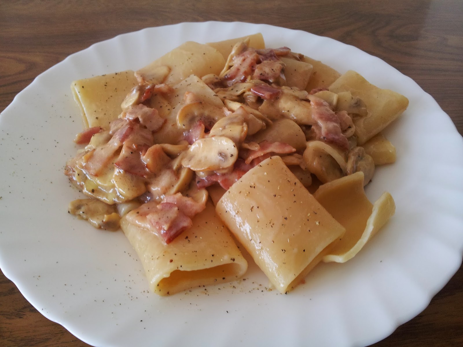 Cuando tengamos el bacon ya salteado, escurrimos la grasa que suelta y en la sartén sin nada de grasa ponemos el bacon, los champiñones que habíamos reservado y la salsa de queso parmesano y rectificamos de sal y pimienta. Dejamos que se mezcle todo bien y escurrimos la pasta.