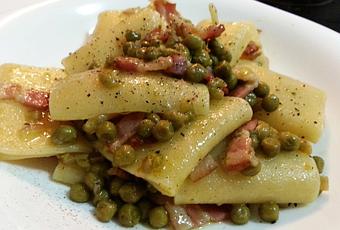 200 gr. de Pasta Paccheri (aquí la ficha técnica), 100 gr. de guisantes, 60 gr. de bacon, 1/3 de cebolla morada, brandy, pimienta, sal y aceite.