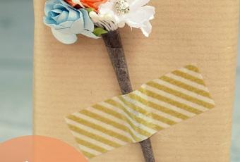 Yo en mi caso he elegido una pieza central mas grande en color naranja y luego dos mas pequeñas, una en azul para contrastar y luego una blanca con un brillante en el centro para dar ese toque de lujo que necesitaba el regalito jejejeY el tape me decante por el marrón por que va perfecto con el papel kraft pero evidentemente puedes ponerlo verde ;)Te ha gustado como ha quedado? que te parece el nuevo uso para esas flores?Besines y feliz semana!!