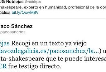 De resultas de lo escrito ayer acerca de Shakespeare, recibo en Twitter un recuerdo de Paco Sánchez, que menciona un texto suyo, largo, muy bueno y muy recomendable, que primero fué conferencia y luego ensayo publicado, además de en La Voz de Galicia [La escritura como modo de vida (Pomar)], en el libro Vagón-bar (Ediciones Internacionales, Madrid, 1999).