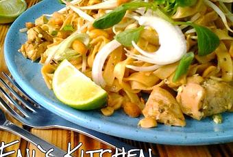 Ingredientes: aceite de oliva2 pechugas de pollo cortada en daditos200 gr de fideos chinos /o pasta tipo tallarines1 cebollino/media cebolla cortada en julianasensalada de brotesbrotes de soja1 puñado de cacahuetes tostados y salados3 huevossalpimientachili a gusto 1 o 2