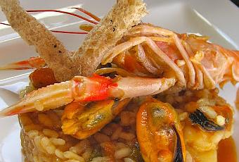 6º " En la misma sartén donde hemos frito las cigalas y la sepia ponemos el arroz y le damos unas vueltas para que se impregne de todo el sabor. También después de retirarlo echaremos un poco de caldo y limpiaremos la sartén y lo echaremos a la paellera.7º " Ponemos el arroz en la paellera donde hemos echo el sofrito, añadimos la sepia, le ponemos un poco de caldo hasta cubrir el arroz y le damos fuego fuerte hasta que comience a hervir, cuando esto suceda le bajamos el fuego y le vamos añadiendo un poco de caldo si vemos que lo necesita, cuando falten unos tres minutos para acabar la cocción, le añadimos los mejillones y las cigalas. (De que dependerá la cocción del tipo de arroz que utilicéis, en este caso el bomba que es el que os recomiendo, El carnaroli también es igualmente comparable, pero su precio también lo es, son un poco más caros pero mucho más buenos, serán unos 15 minutos de cocción y cinco de reposo).