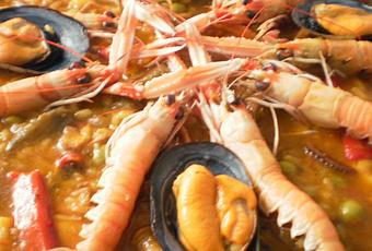 Echar el refrito a la paellera, agregar la carne de las gambas peladas, los calamares cocidos, las almejas (escurridas previamente), los chicharos y el arroz, dejar pasar dos o tres minutos e ir añadiendo el agua bien caliente. Rectificar de sal si fuese necesario.