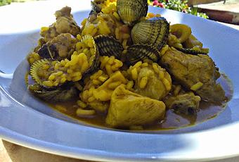 &version; Para 6 personasIngredientes:- 1 kilo de arroz - 1/4 kilo de berberechos- 1 pollo en trozos- 1/4 kilo de gambas arroceras - 1 pimiento verde - 1 pimiento rojo - 2 tomates maduros - 1 limón - sal, aceite y agua.- colorante alimenticio u azafrán Elaboración:Pelamos las gambas, las cascaras y las cabezas las colocamos en un cazo y las ponemos a cocer para preparar un fume para nuestra paella, colocamos nuestra paellera en el fuego y refreímos el pollo y el conejo hasta que este la carne dorada, a continuación añadimos los pimientos previamente cortados en trocitos, y dejamos refreír todo junto a fuego lento.Rallamos los tomates en un plato y añadimos a nuestra paella y sofreímos todo junto, incorporamos los berberechos una vez bien lavadas y dejamos cocinar hasta que se abran. Cogemos nuestro arroz y lo vaciamos en un bol donde entre todo , pues luego mediremos a la hora de echar nuestro fume , en mi caso suelo echar 2 partes y media por el arroz que le pongo ,dejamos que comience a cocinar a fuego fuerte hasta que empiece a hervir y después bajamos un poco el fuego , probamos el caldo y corregimos el punto de sal a nuestro gusto , cuando se consuma el caldo , retiramos y colocamos nuestro limón encima en trocitos , y tapamos 2 minutos dejándolo reposar ,espero que os salga muy bueno ....Mi receta esta presentada sobre platos de porcelana de la fábrica Porvasal en Chiva (Valencia).Receta elaborada con el menaje de hostelería y cocina de la fábrica Supreminox en Vilassar de Mar en (Barcelona).&version;