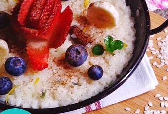 Lo dejamos enfriar a temperatura ambiente, lo guardamos en la nevera hasta el momento de servir.3.- Decoramos con la fruta fresca. Lavamos la fruta, la secamos con papel de cocina y decoramos el arroz con la fresa y los arándanos. Pelamos un plátano y cortamos 3 o 4 rodajas. Ponemos las flores de lavanda plantadas en el arroz y las ramitas fresca de menta. Esparcimos sobre la paellera la canela en polvo y la ralladura de la piel de un limón. Servimos frió.