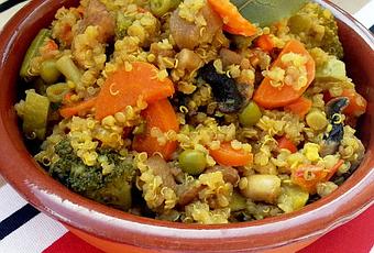 - Lavamos bien la quinoa y la incorporamos a la olla, la tostamos un poco y añadimos las verduras. Cubrimos todo con el caldo que habíamos preparado y lo llevamos a ebullición. Cuando hierva bajamos el fuego y cocemos la quinoa y las verduras unos 15 minutos más hasta que queden blandos.
