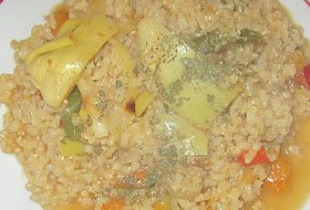 Agregamos entonces el arroz y rehogamos un par de minutos. Añadimos el azafrán y el pimentón dulce. Incorporamos el caldo de verduras caliente (aproximadamente 1 litro y 200 ml) y salpimentamos. Dejamos al menos 20 minutos al fuego, hasta que el arroz esté blando y agregamos entonces las alcachofas bien escurridas y troceadas.