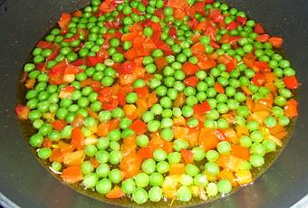 En una paella o sartén con un chorro de aceite vamos cocinando los guisantes y los pimientos rojos cortados en trozos pequeños, añadimos sal y pimienta.