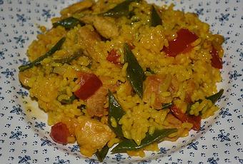 350 gr de arroz150 gr de judías verdes300 gr de pechuga de polloun litro de caldo de polloun tomateuna cebollaun diente de ajo1/2 pimiento verde1/2 pimiento rojounas hebras de azafrán50 mililitros de aceite de olivapimienta y sal