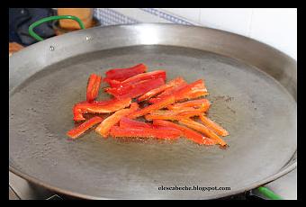 Para empezar ponemos todo el aceite en la paella y sofreímos el pimiento rojo cortado en tiras. Después lo sacamos a un plato y lo reservamos.