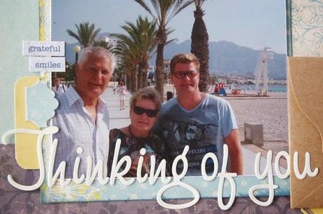 En el papel de fondo utilicé Glimmer mist "Fall Breeze" y "White Linen" de Dylussions para crear las gotitas. Apliqué tinta Distress "Stormy Sky" en los bordes de algunos papeles. Las etiquetas son o bien de varias colecciones de October Afternoon que tengo por terminar o bien utilicé el troquel de etiquetas de 3" de Artemio (es de los rosas que tiene un set de 4 mini etiquetas). También redondeé algunos bordes con la corner chomper.