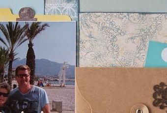 En el papel de fondo utilicé Glimmer mist "Fall Breeze" y "White Linen" de Dylussions para crear las gotitas. Apliqué tinta Distress "Stormy Sky" en los bordes de algunos papeles. Las etiquetas son o bien de varias colecciones de October Afternoon que tengo por terminar o bien utilicé el troquel de etiquetas de 3" de Artemio (es de los rosas que tiene un set de 4 mini etiquetas). También redondeé algunos bordes con la corner chomper.