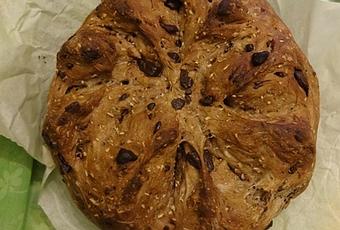 2. تضاف الشوكولاته مكسرة الى قطع صغيرة ويدلك العجين لمدة 5 دقائق حتى يتم دمج جميع قطع الشوكولاته في العجين . يدهن وعاء بزيت نباتي ثم يوضع العجين في الوعاء و يدور بحيث يصبح مدهونا بالزيت. يغطى العجين و يترك حتى يتضاعف حجمه.3.يدلك العجين قليلا ثم يعطاه الشكل المرغوب فيه . يترك يختمر لمدة 25-30 دقيقة . يخبز العجين لمدة 15 دقيقة على حرارة 200 درجة مئوية ثم تخفض درجة الحرارة إلى 180 درجة مئوية، و يخبز لمدة 25-30 دقيقة. يترك الخبز فوق شبكة حديدية