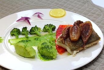 - Assemble the dish, serving a layer of pea cream, a few pieces of broccoli, and small balls of mashed potatoes. Place roasted pepper strips, cod and end up with a caramelized shallots.