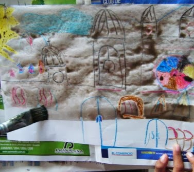 Los estudiantes del cuarto año interpretaron las iglesias del centro histórico con formas elementales. Aplicaron una técnica mixta de la siguiente forma:1.- Dibujaron con crayones. 2.- Se aplicó una capa de aguada de témpera café a toda la hoja, así se le dio un acabado de envejecido. 3.-El trabajo terminado. Fuentes:http://www.quitoadventure.com/espanol/informacion-ecuador/acerca-ecuador/quito-patrimonio-cultural.htmlhttp://www.in-quito.com/uio-kito-qito-kyto-qyto/spanish-uio/atractivos-turisticos-quito-ecuador/quito-atractivos-turisticos-virgen-del-panecillo.htmImagen tomada de:http://es.wikipedia.org/wiki/Quito