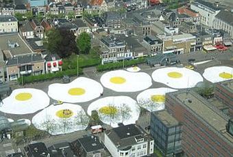 ¿Puede una intervención en el espacio público ironizar y a la vez alertar sobre el cambio climático? Cada uno de estos huevos fritos nos recuerda el hecho inevitable de que la temperatura del planeta sube cada año, los huevos grandes miden unos 100 pies y son completamente planos mientras que los pequeños adoptan un perfil tridimensional.