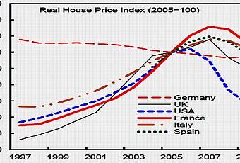 Esta gráfica del FMI nos muestra que la burbuja inmobiliaria iniciada en Estados Unidos a mediados de los años 90 tuvo sus "seguidores" europeos, especialmente Francia, Italia y el Reino Unido, que en menos de diez años duplicaron el precio de la vivienda. España permaneció acoplada al ritmo estadounidense y, al igual que los otros países, tardó más en poner el freno permaneciendo más tiempo en la inercia inflacionaria del ladrillo. Esto desmiente la tesis de que la burbuja inmobiliaria y la actual crisis crediticia era básicamente un producto estadounidense. Exceptuando a Alemania, toda Europa participó de la burbuja al tragarse el cuento de que la economía estaba rebosante de salud. Alemania fue el único país que se mantuvo alejada de la burbuja y es el único en el cual los precios de la vivienda no solo no se sumaron a la escalada alcista sino que incluso descendieron.