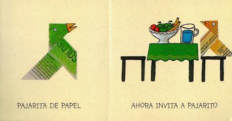 En Pajarita de Papel se muestra las rutinas de la comida: poner el mantel, colocar la jarra de agua, el frutero, dos recipientes que aparecen primero vacíos y luego se llenan para finalmente invitar a alguien a la mesa, disfrutar y compartir, fomentando así la amistad.