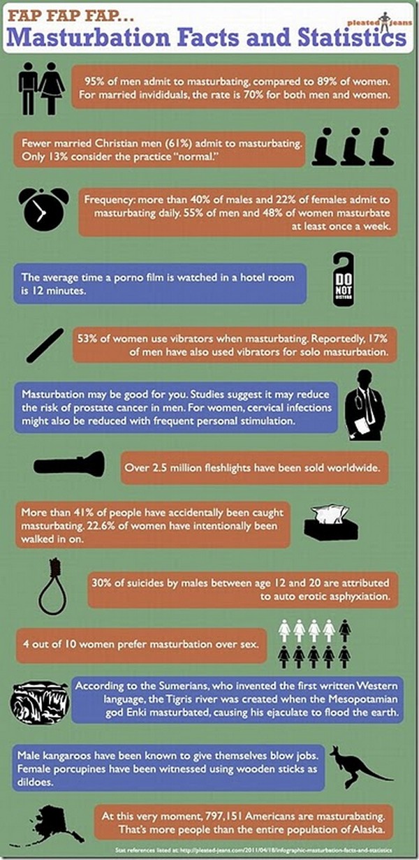 Más de 2,5millones deFleshlights (una especie de vagina artificial, utilizada para la masturbación masculina) se han vendido en el mundo Más del 41% de las personas que hansido consultadas al azar se masturban. De ellas el 22,6 % son mujeres. Un 30%de los suicidios devaronesentre los 12y 20 años se atribuyena la asfixia autoerótica. 4 de cada 10mujeres prefierenla masturbaciónal sexo. De acuerdo conlos Sumerios, que inventaron la primera lengua escrita occidental,el ríoTigrisfue creadocuando eldios Enkimesopotámicose masturbaba, provocandosu eyaculaciónpara inundar la tierra. Cangurosmachoshan sido vistos practicandosexo oralPuerco espineshembras se hanvisto utilizando palos de maderacomo consoladores. En este mismo momento,797.151 (*)estadounidensesse masturban. Eso esmás gente quetoda la población deAlaska. Ya lo dijo Allan Stewart Königsberg quien tal vez le resulte más familiar si le llamo Woody Allen: “El sexo es como jugar albridge. Si no tienes una buen compañero, más vale que tengas una buena mano." (*) Perdón, acabo de recordar que tengo algo que hacer, cambiar esta cifra a 797.152. La carne es débil.