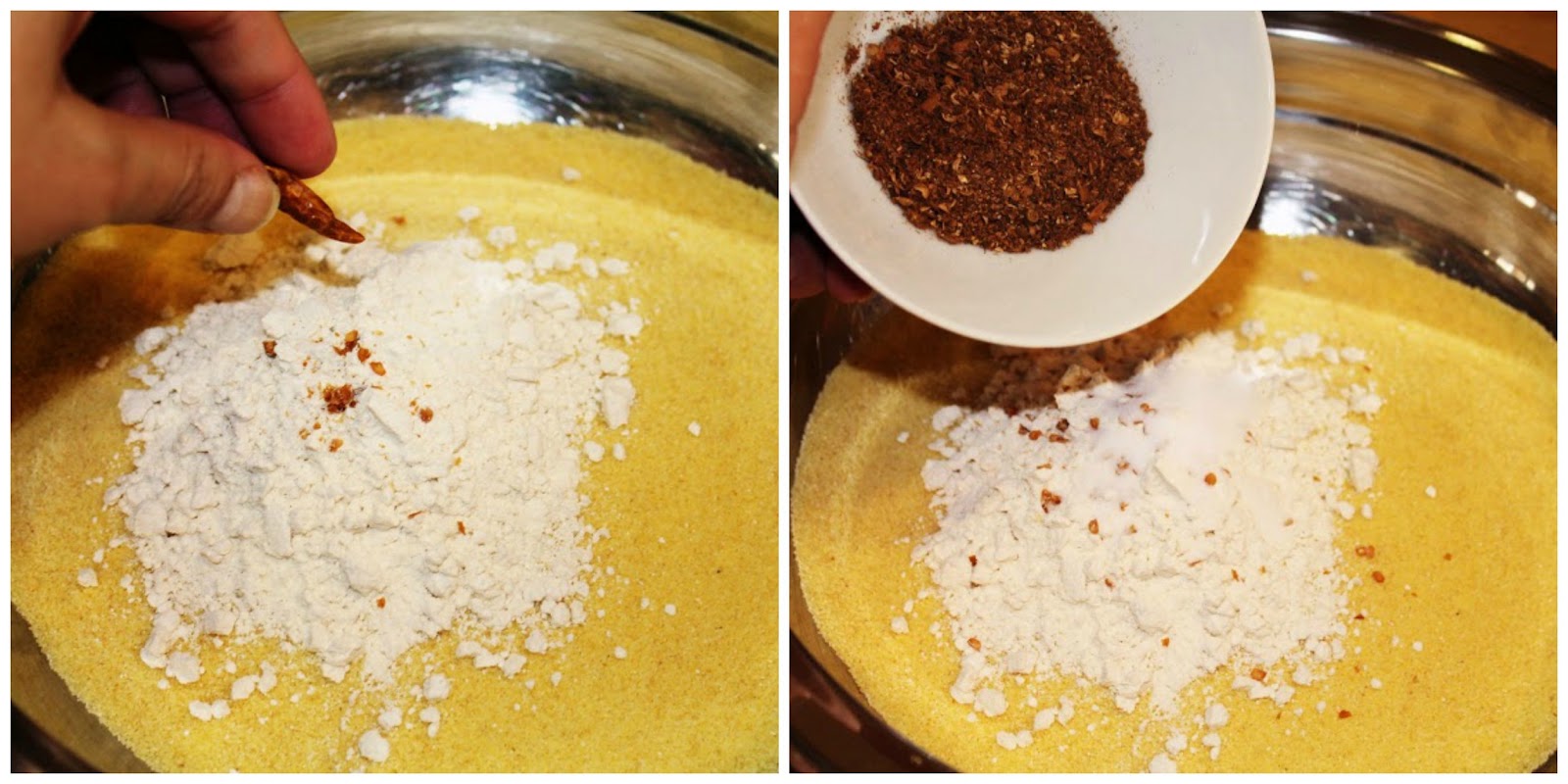 dos harinas y el bicarbonato. Añadimos la/s cayena/s picadas y la pasta garam masala. Mezclamos bien.