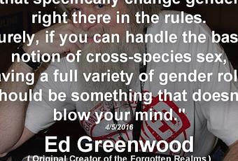 Dice:"D&D tiene semi-orcos, y semi-dragones, y semi-elfos, y tiene objetos mágicos que específicamente cambian el genero, justo ahí en las reglas. Seguramente, si puedes aceptarlas la noción básica de sexo entre especies, tener una total variedad de roles de genero debería ser algo que no te hiciera estallar la cabeza"