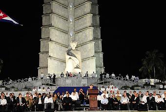 Es esta la Plaza de importantes marchas del Primero de Mayo de la capital; en 1996 contra el bloqueo y la Ley Helms-Burton, que aún se mantienen; del enorme Desfile de 1999 y de la Tribuna Abierta de la Juventud, los Estudiantes y los Trabajadores del 2000, donde Fidel expuso su concepto de Revolución, que en estos días millones de cubanos hacen suyo con su firma, en un acto de voluntad sagrado (Aplausos).