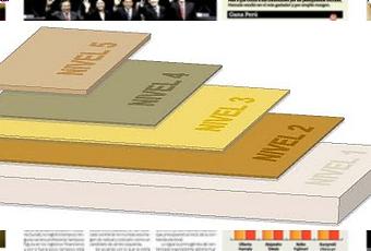 NIVEL 5: REPINTE DE PIGMENTOS METÁLICOS AGLUTINADOS CON RESINA VINÍLICANIVEL 4: CAPA DE BARNIZ OSCURECIDO POR PROCESOS DE OXIDACIÓNNIVEL 3: LÁMINA DE LATÓN (Cu/Zn) PAN DE ORO FALSONIVEL 2: IMPRIMACIÓN ADHESIVA PARA LA FIJACIÓN DE LA LAMINA DORADA (SISA – MIXTIÓN)NIVEL 1: SOPORTE (YESO - MADERA, SEGÚN LAS ZONAS)Según las catas realizadas en los antepechos, se pueden diferenciar de forma generalizada dos niveles decorativos que corresponden con el dorado original, protegido por una capa de barniz y el repinte de purpurina aplicado con la intención de adecentar la imagen interior del palacio.