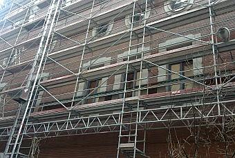 Instalación de andamio mediante pórticos en la zona inferior para permitir el espacio para acopios, accesos y trabajos en planta baja. Siempre que el andamio tenga 2 alturas o más deberá anclarse a fachada mediante taco-gancho y pieza de anclaje, repitiéndose en distintos puntos.