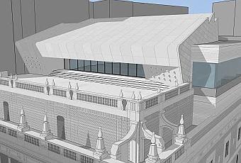Las exigencias del Proyecto redactado plasma en el horizonte una sala de usos múltiples en la cubierta del edificio del Palacio de la Música de Madrid. Esta sala se cierra con una cubierta novedosa en su forma, ya que es de forma irregular y manteniendo una serie de ondulaciones tanto en la parte superior como en las fachadas.