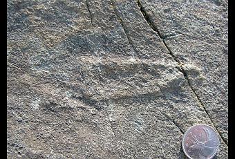Ejemplar completísimo de Thectardis avalonensis. La moneda mide 23.88 mm de diámetro. Imagen propiedad de la NASA.Rango temporal: Ediacarano, entre hace 575 y 565 ±3 Ma.