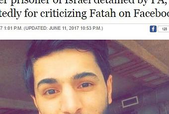 Nassar Jaradat, de 23 años de edad, ha sido detenido por la Autoridad Palestina (AP) por unos mensajes de Facebook críticos con el partido gobernante de la Autoridad Palestina, Fatah, según informes de medios de comunicación locales y el Frente Popular para la Liberación de Palestina (FPLP).