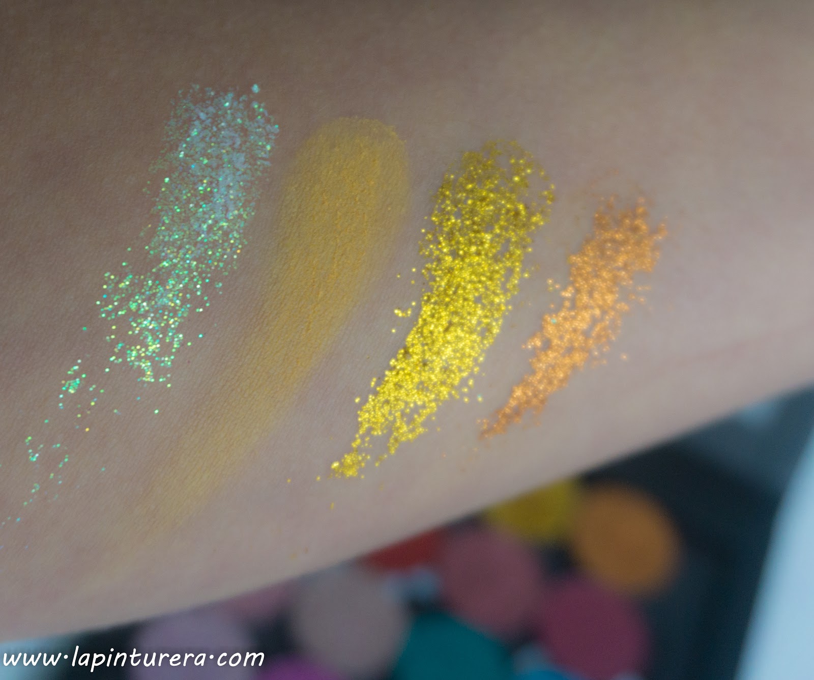 Como podéis ir viendo, las sombras mate pigmentan y transfieren estupendamente y me gustan mucho por que son tonos poco vistos. Además, las sombras glitter no me han decepcionado. Aunque - como es típico en este formato - hay que tener cuidado y maquillar el ojo antes del rostro, el glitter se agarra bien al párpado una vez aplicado. Yo he llevado los looks que veremos mañana durante horas sin que se movieran las partículas (eso sí, siempre llevo prebase, pero ninguna especial para glitter, una sencilla de Essence que tengo por casa).