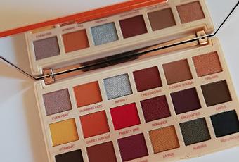 La paleta viene dentro de una cajita de cartón en tono cobre con letras doradas y negras. Al girar la caja podemos encontrar la información sobre los ingredientes que lleva, los tonos y nombres de las sombras y también información sobre la marca. También queda claro que es una paleta Vegana y Cruelty Free. La paleta viene protegida por un plástico transparente dentro de esta caja. Una vez quitas el plástico ves que la paleta está hecha con plástico duro, la parte de atrás de de color crema mate, y la parte delantera es de tono cobre efecto espejo, con letras en tono negro y crema. Al abrirla te encuentras un gran espejo en la zona interior de la tapa, un plástico protector transparente y 18 sombras a cual más bonita.